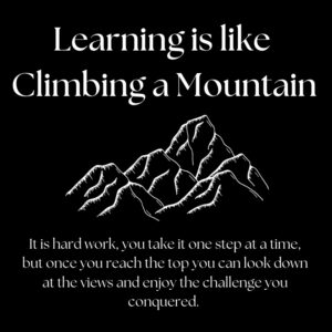 Learning is like climbing a mountain, I chose this metaphor because it resonates personally with how I have seen my own academic career go. I think heading into my fifth year I have learnt that this is an incredibly difficult and time consuming achievement but I know the end goal is so worth it. Learning is like climbing a mountain means although it’s hard and takes a lot of effort once you make it to the top you get to look down and know you conquered this incredible achievement. I think this metaphor is appropriate, it may not seem that way for everyone but for students who have found times difficult or wanted to quit the idea of finally one day getting to look at the amazing achievement it is all worth it in the end. I also think it is appropriate because for mountain climbers it is normal for them to have someone coaching them along the way, or for them to have friends doing it with them. In education we have our teachers, parents and peers that are all alongside us supporting us year by year and step by step.